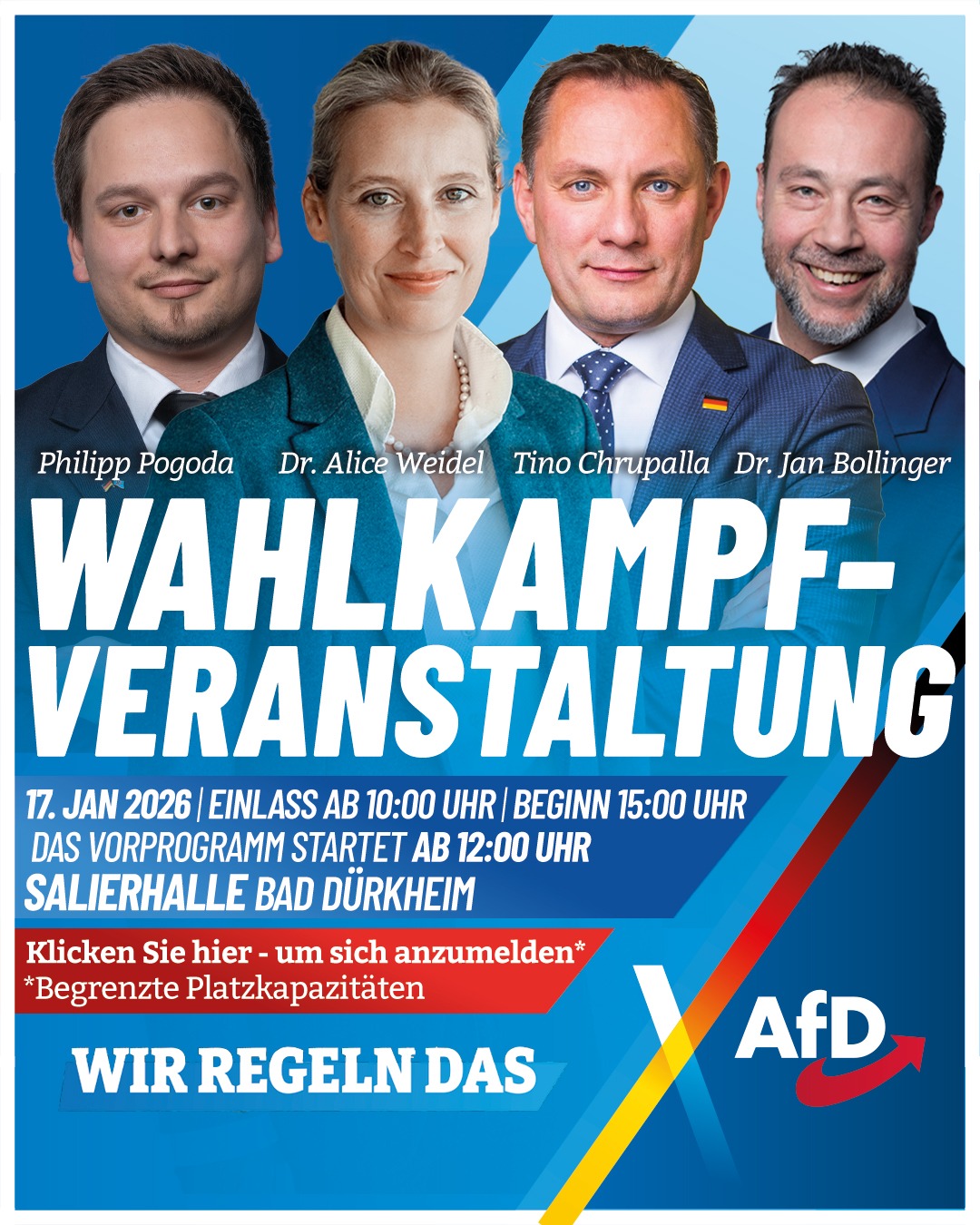 - 09.01.2026, Kyllburg, Bürgerstammtisch der AfD Bitburg-Prüm, im Hotel Eifeler Hof, Hochstr. 2, 54655 Kyllburg, ab 19.30 Uhr