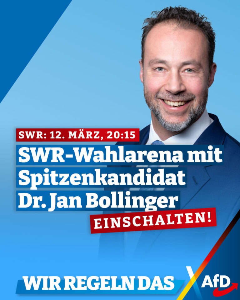 Heute Abend ist es soweit: Unser Spitzenkandidat Dr. Jan Bollinger in der SWR-Wahlarena. Wir zeigen, warum wir die einzige Partei sind, die glaubwürdig für die Politikwende steht! #WirRegelnDas Einschalten: SWR-Fernsehen, 12. März 20:15