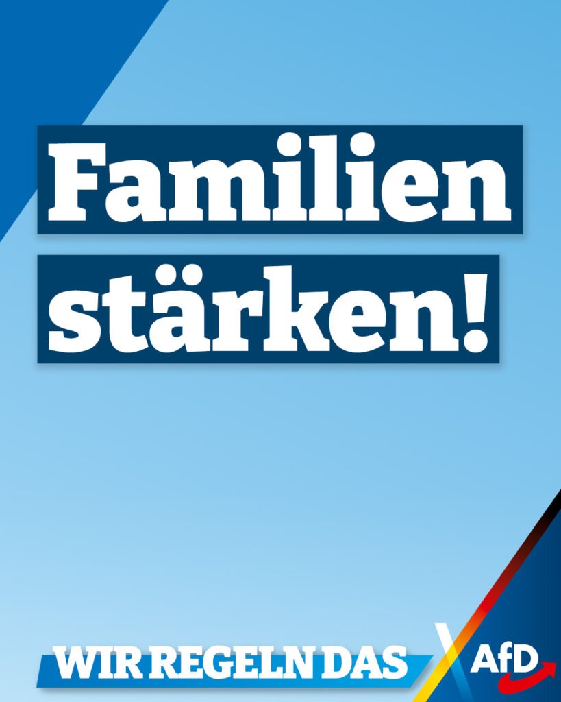 Für die AfD ist die Familie die Keimzelle der Gesellschaft. Familie ist eine Gemeinschaft aus Fürsorge, Liebe und Solidarität. In ihr werden Werte und Kultur weitergegeben, sie verbindet die Vergangenheit mit der Gegenwart und Zukunft. #WirRegelnDas