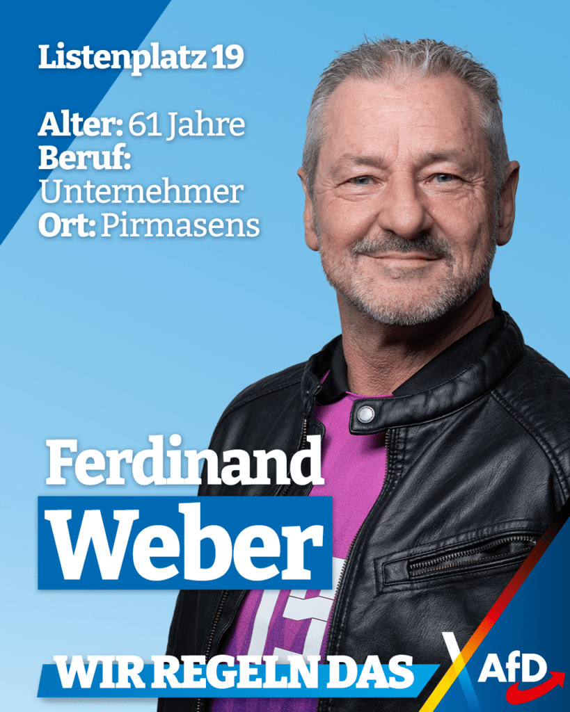 Ferdinand L. Weber (61) ist Unternehmer und Mitarbeiter von Sebastian Münzenmaier MdB sowie der Landesgruppe Rheinland-Pfalz/Saar im Deutschen Bundestag. Er trat 2016 der AfD bei und wurde im selben Jahr zum stellvertretenden Vorsitzenden des Kreisverbandes Südwestpfalz gewählt. Von 2018 bis 2022 führte er den Kreisverband als Vorsitzender. Seit 2025 ist er Schatzmeister des Kreisverbandes Zweibrücken.
